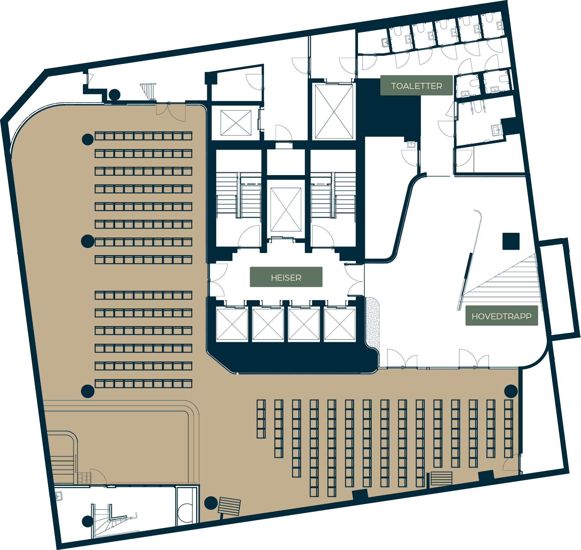 Til sammen utgjør hele Vella en 336 m2 vinkelformet sal som gir muligheter for mange spennende løsninger og oppsett. Man kan bruke alt areal til publikumsplasser mot scenen, eller holde av noen av rommene for mingling, stands og servering.
